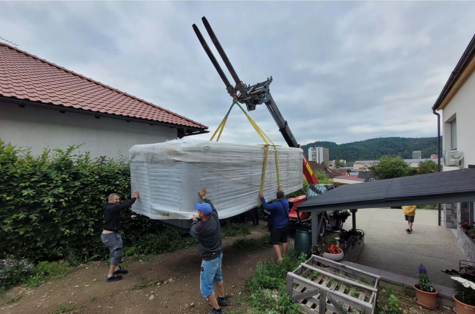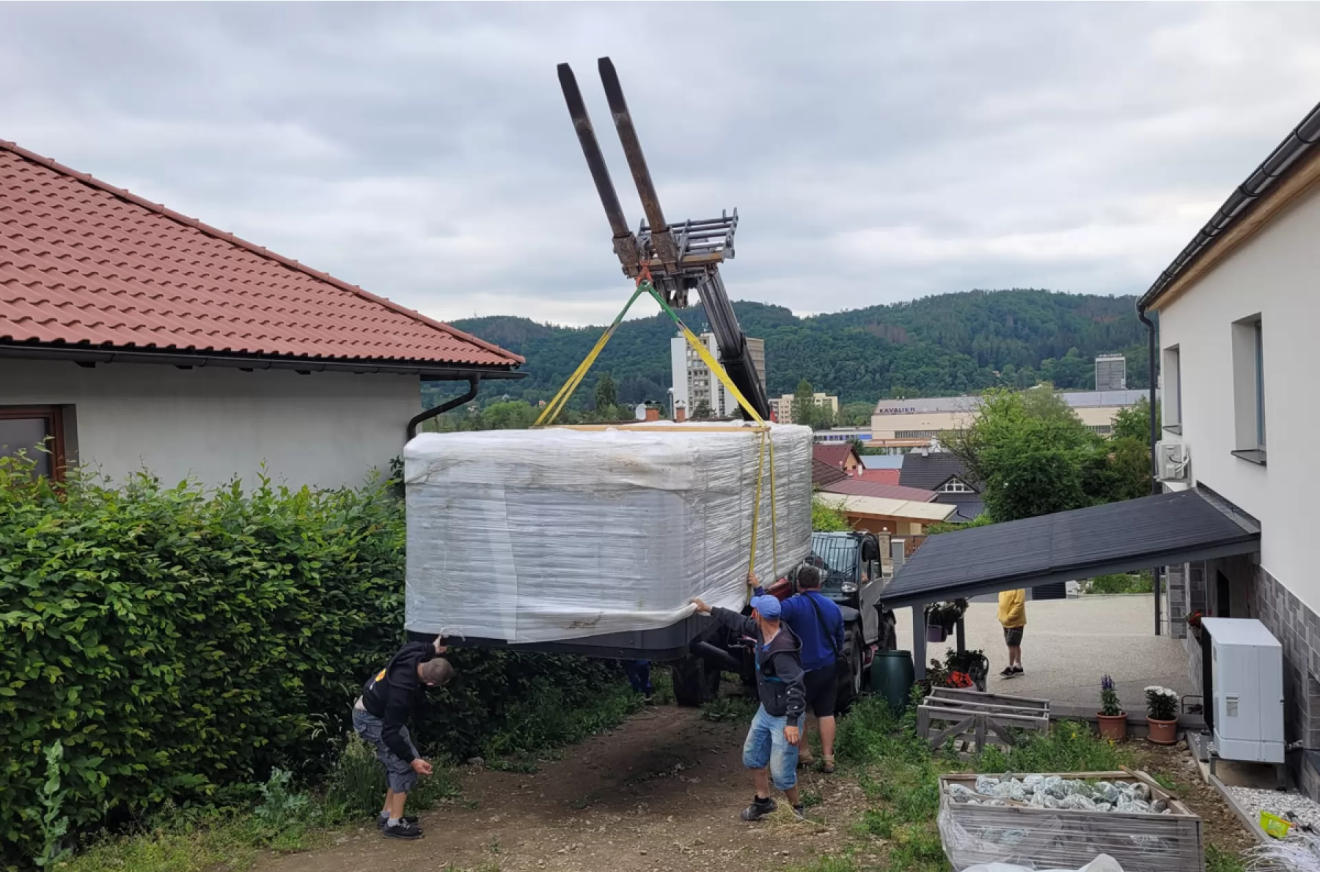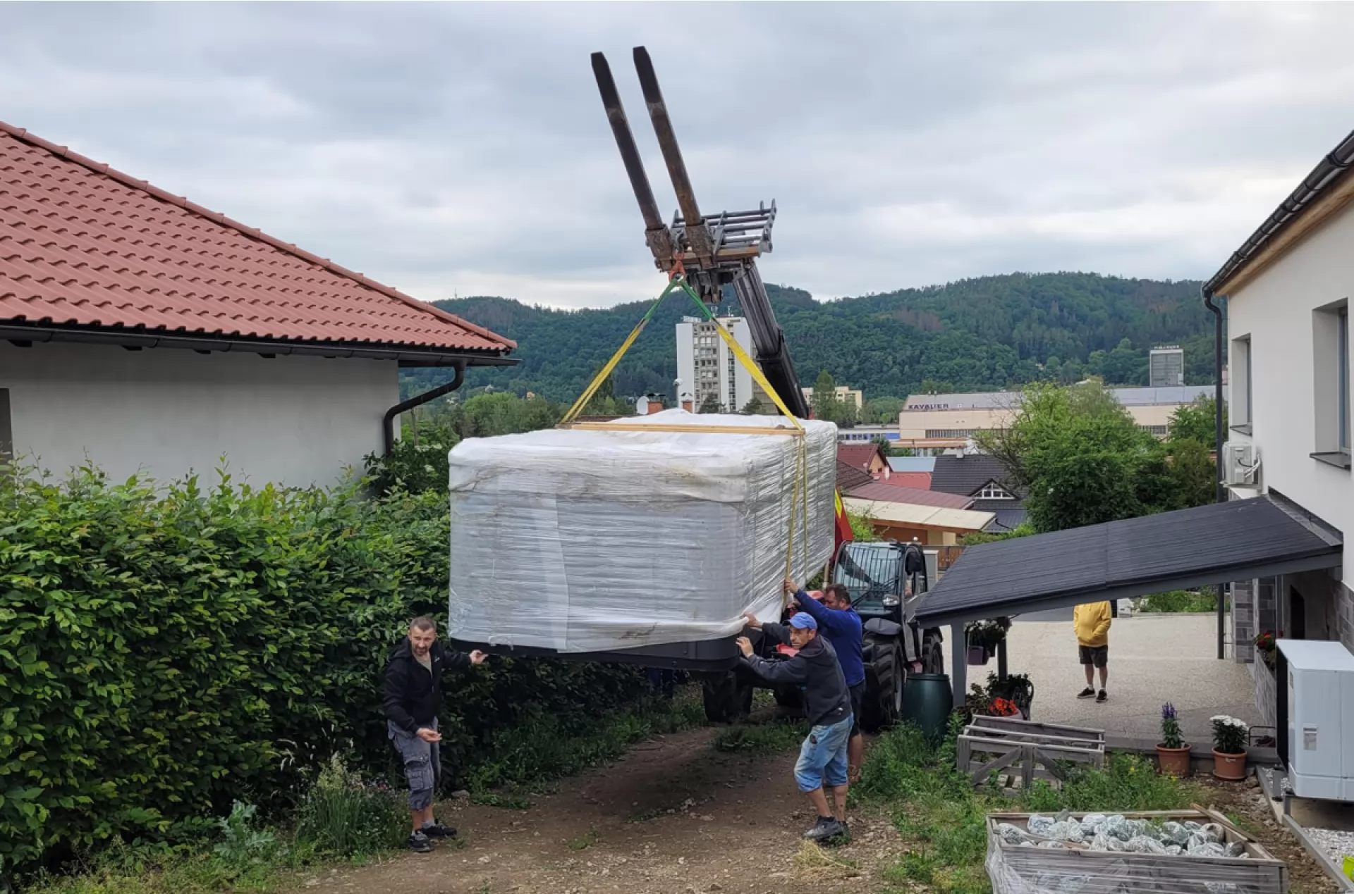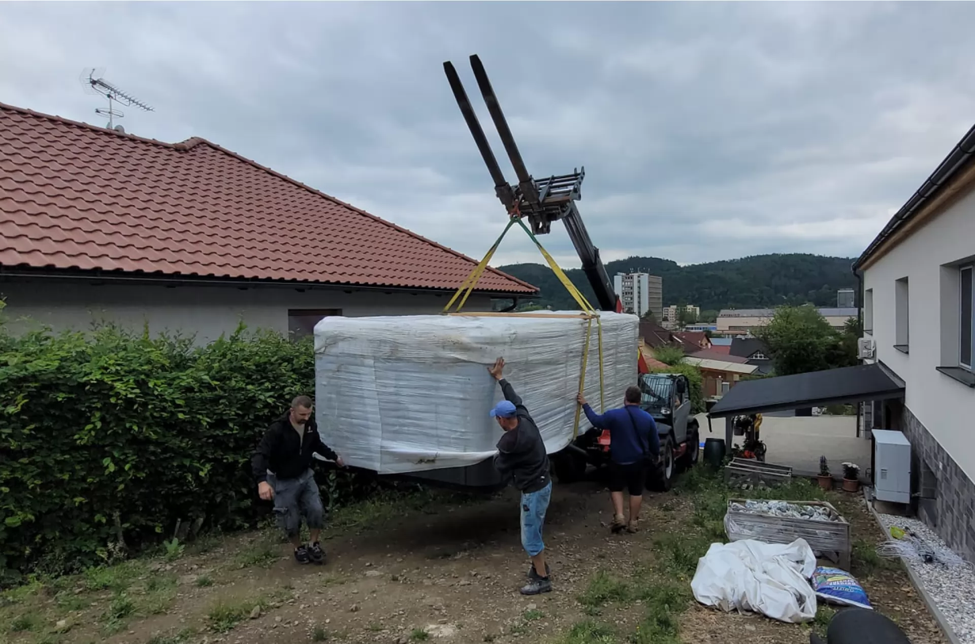 We rented a telescopic handler Manitou MT 1840 from our VZVRENT rental company to a client in Sázava. Our experienced driver with the manipulator settled the giant whirlpool here. The advantage of the manipulator is their telescopic arm, thanks to it they can manipulate with load even over an obstacle, as was the case here as well.