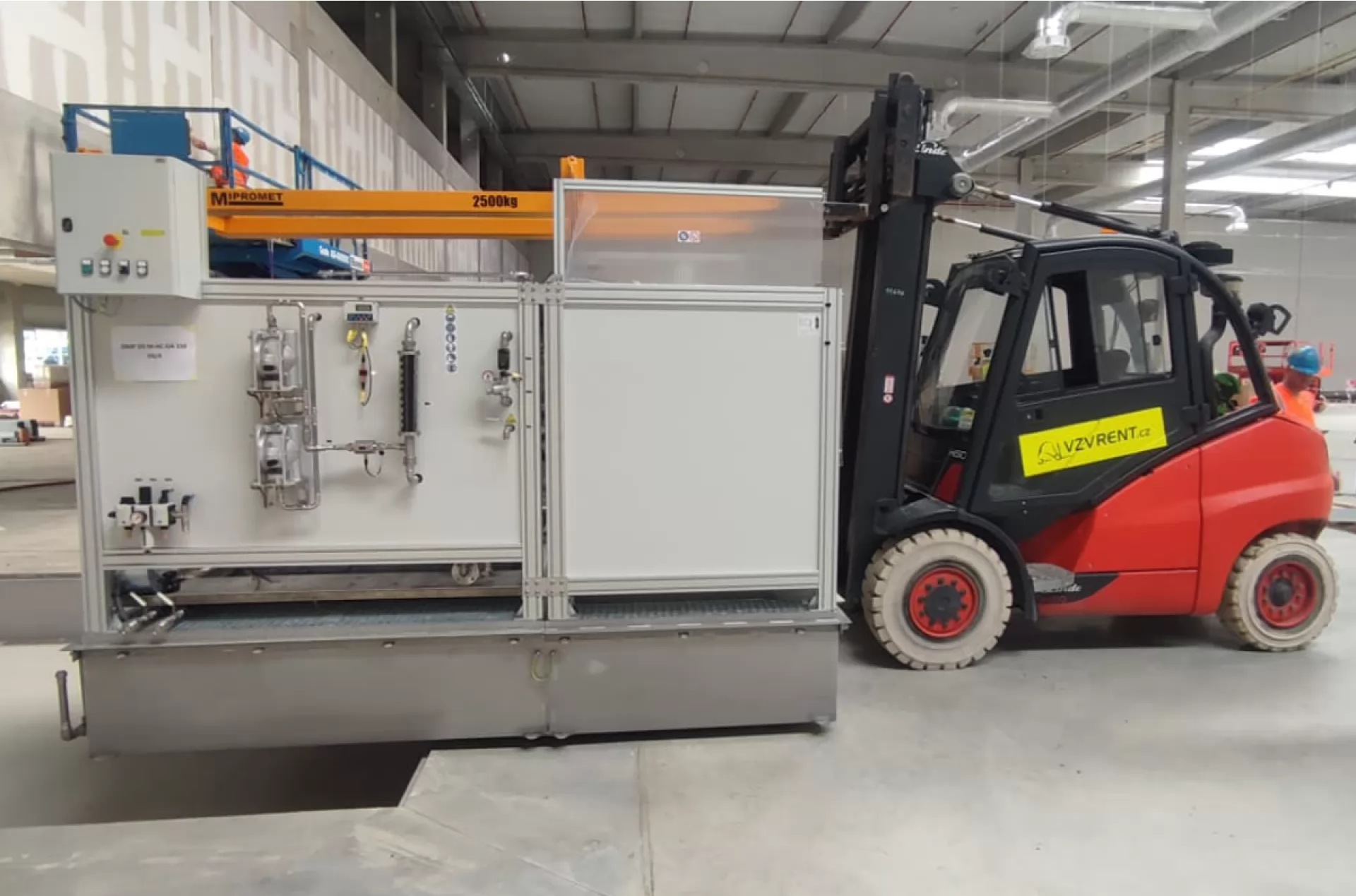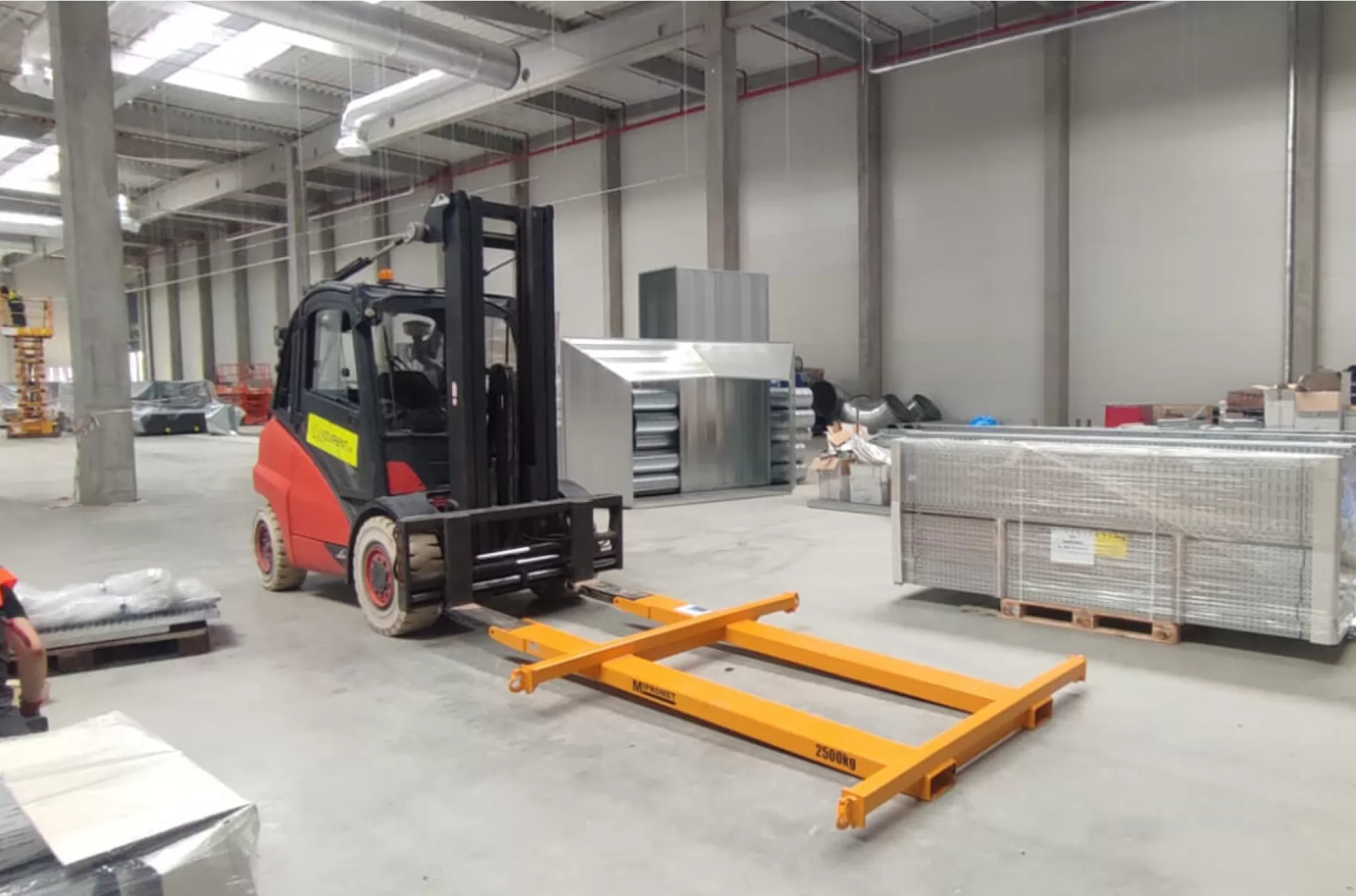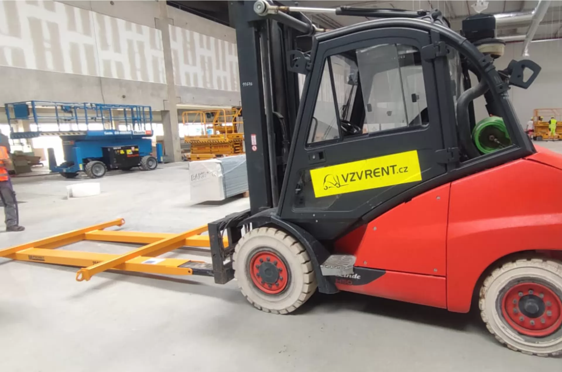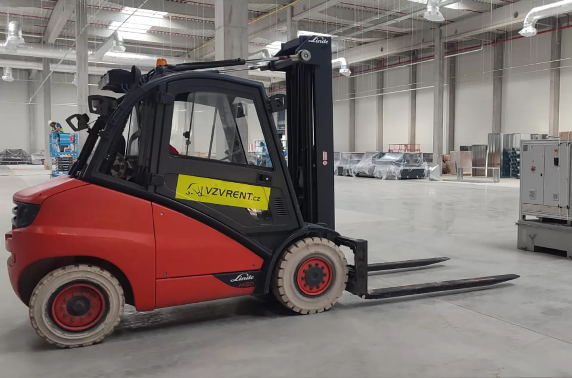 Společnost Amazon využívá dlouhodobého pronájmu několika našich strojů pro stavbu nové budovy Jirkově. Tentokrát v akci můžeme vidět plynový vysokozdvižný vozík Linde H 50 T i se speciálním nástavcem na vidle.