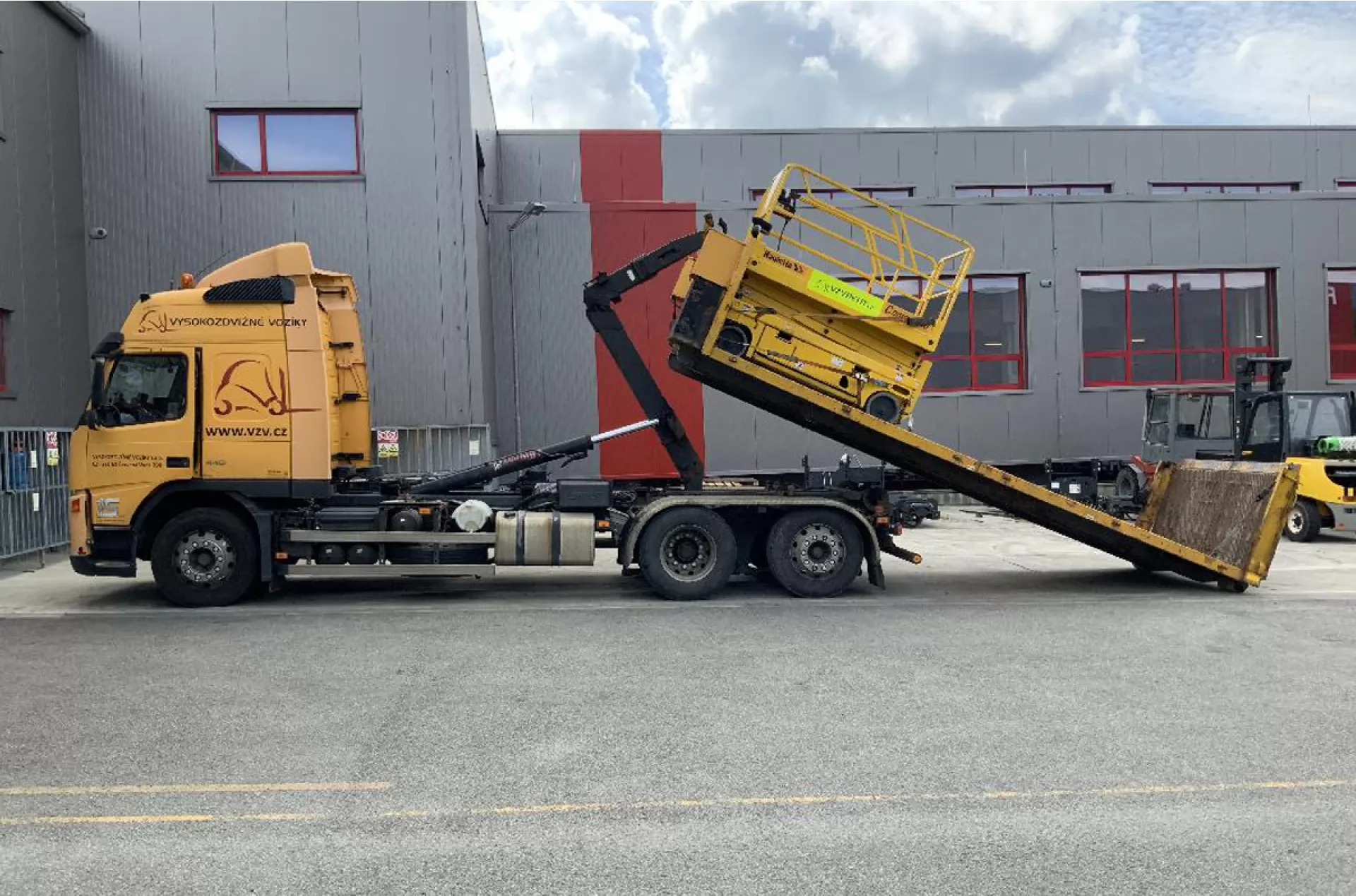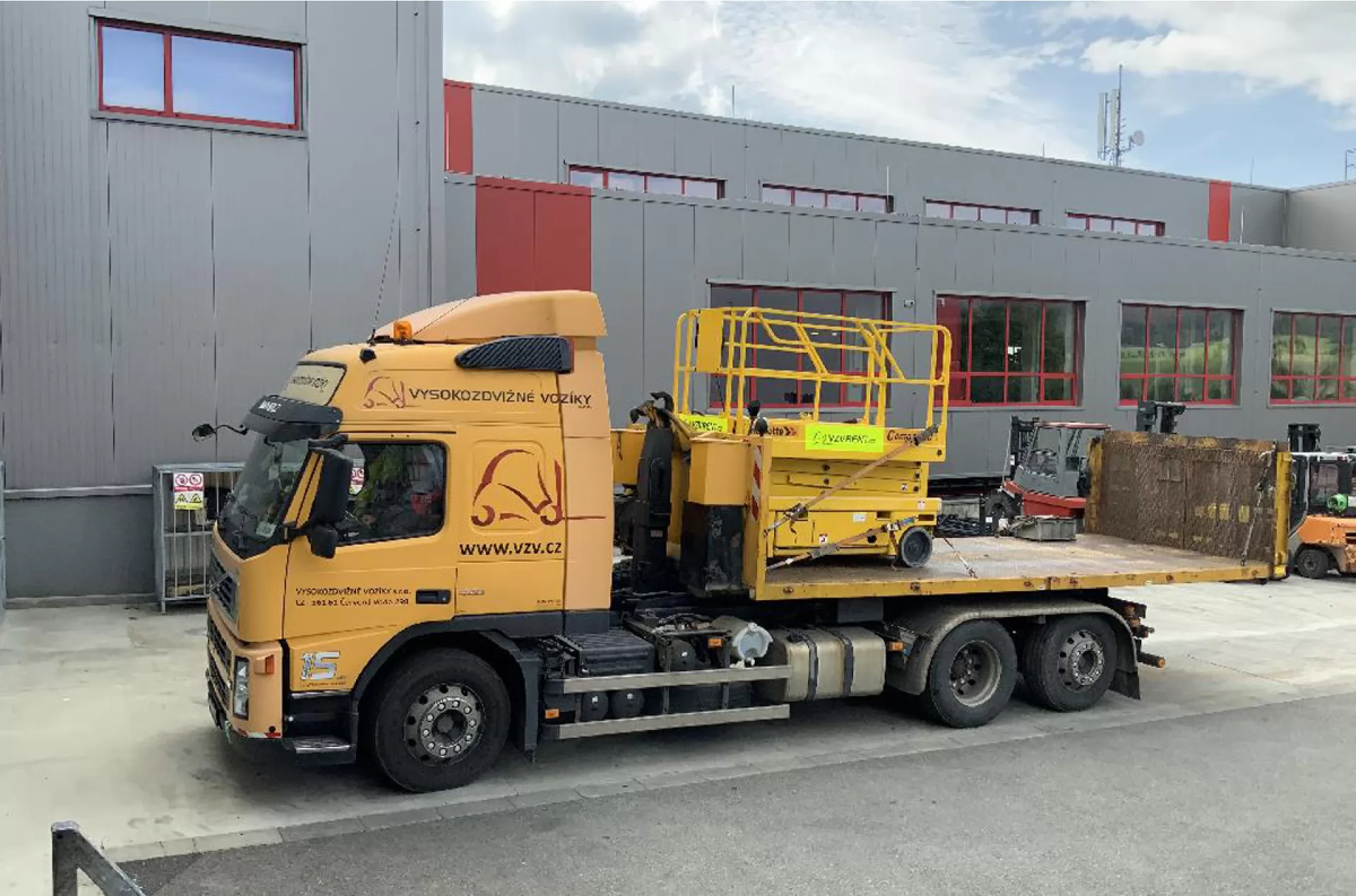 Lehké kontejnerové vozidlo je rychlé a operativní, využíváme jej převážně pro kratší vzdálenosti pro jeden až dva stroje. Až 3 vozíky s vykládkou na zem zvládne vozidlo s kapacitním kontejnerem. Pro převoz více strojů najednou máme k dispozici návěs se sklopnou nájezdovou rampou, který umožňuje pohodlný nájezd všech vozíků. Pro velkotonážní a nadrozměrné stroje využíváme podval včetně nutných povolení a doprovodného vozidla.