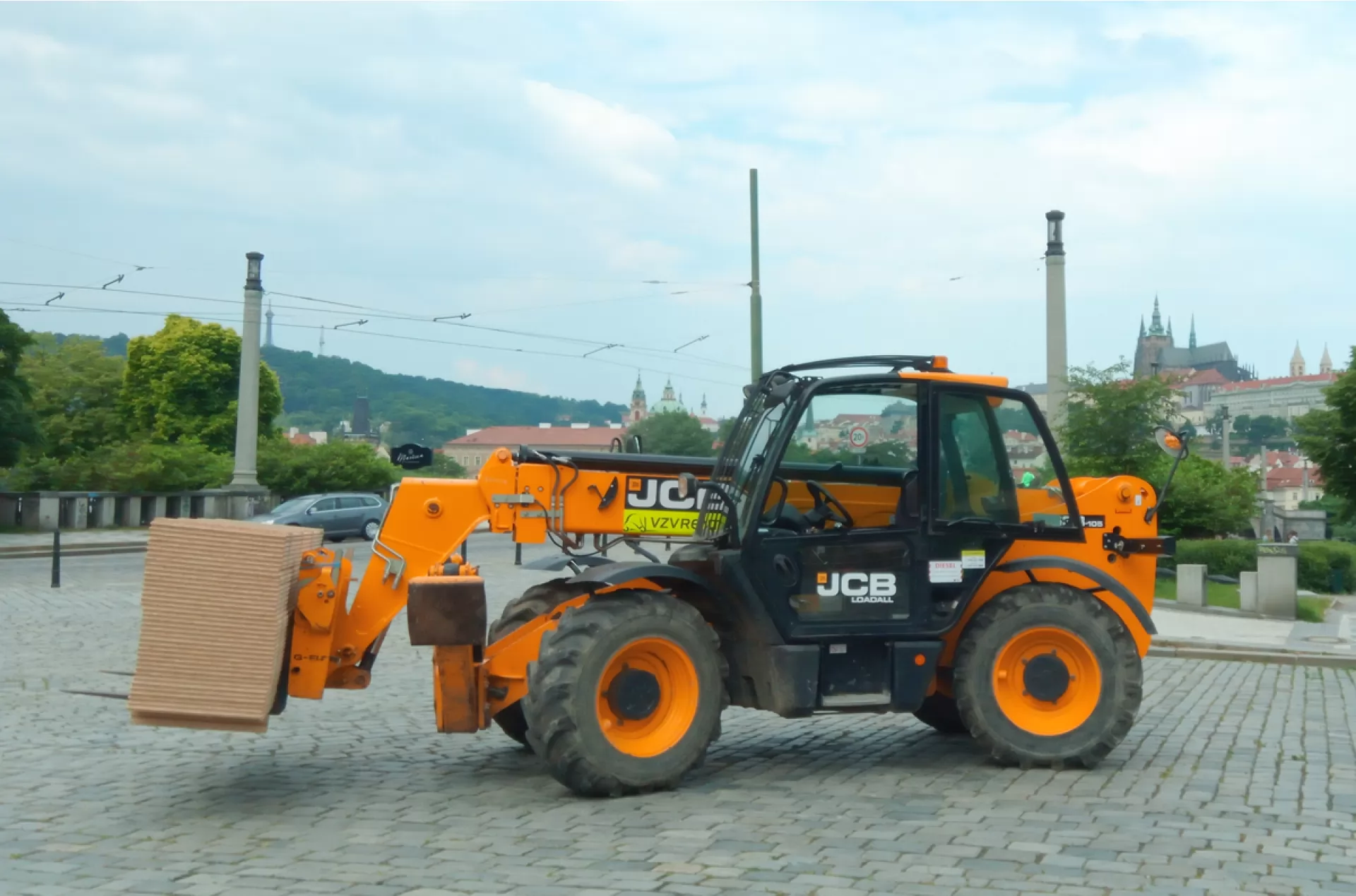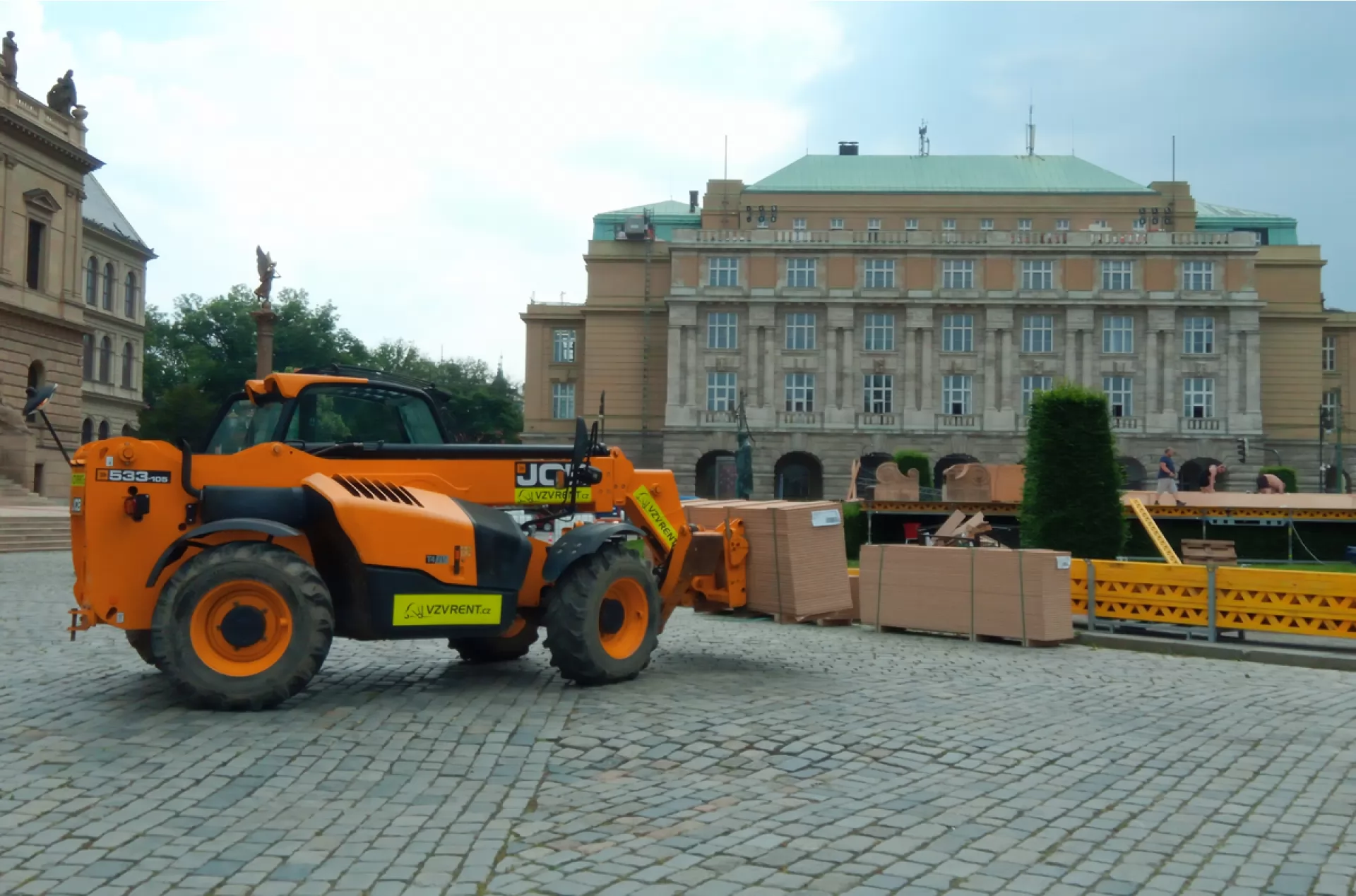 V hlavní roli dnešního pronájmu VZV RENT je teleskopický manipulátor JCB 533-105 a náš řidič Martin. Ten se s pomocí stroje zapojil do montáže dekorací a kulis, které budou sloužit při natáčeního nového historického filmu. Zákazníkovi jsme zajistili dopravu s vykládkou na zem a dodáním do centra Prahy.