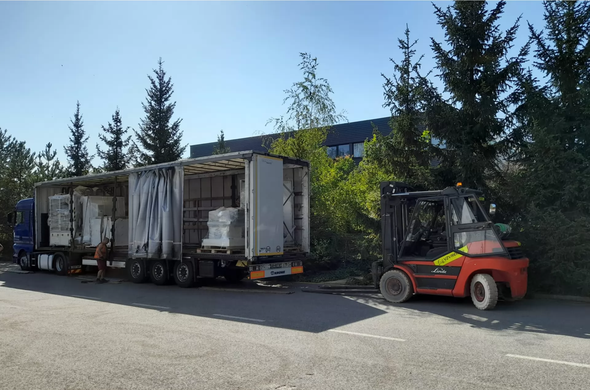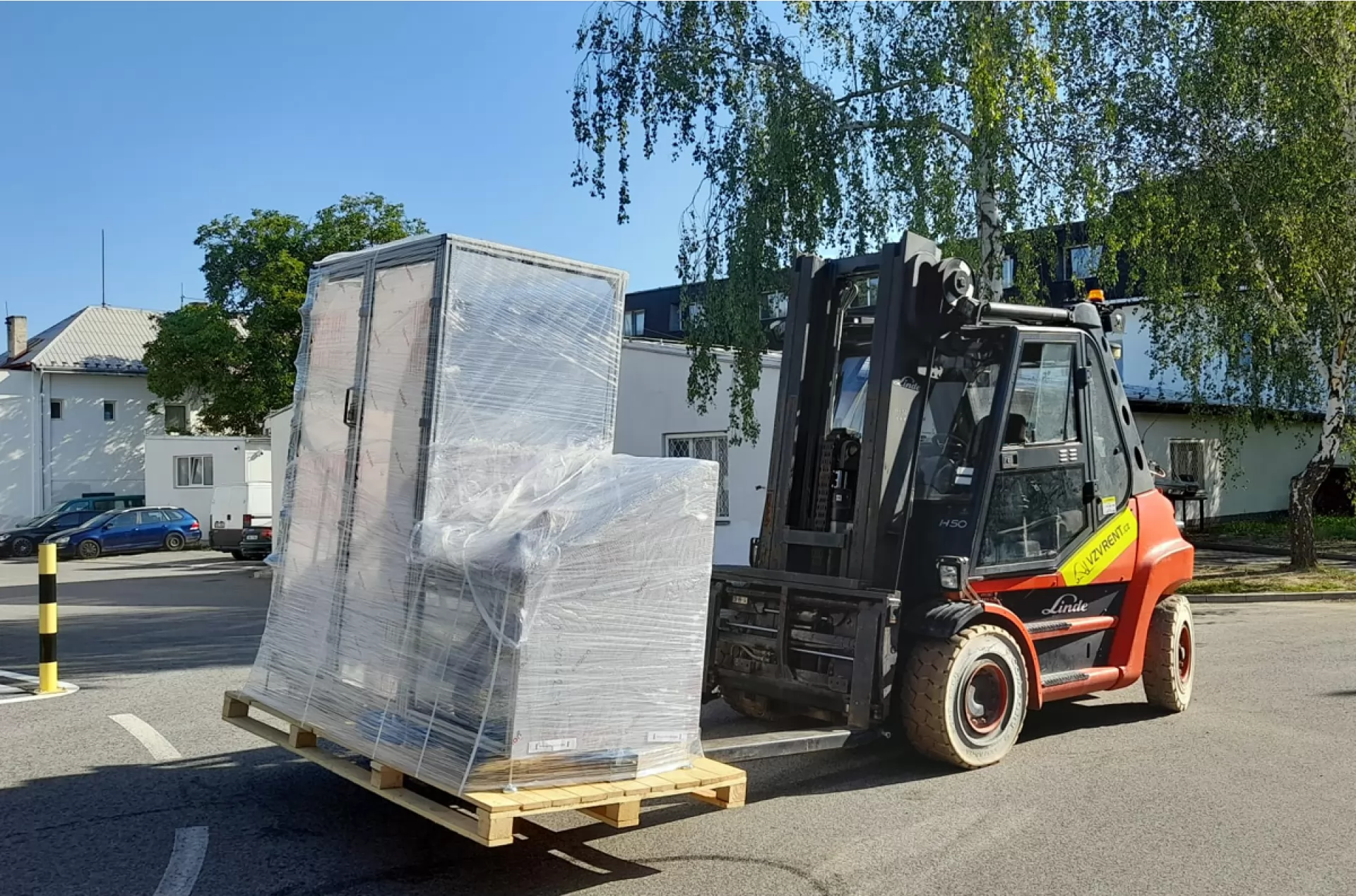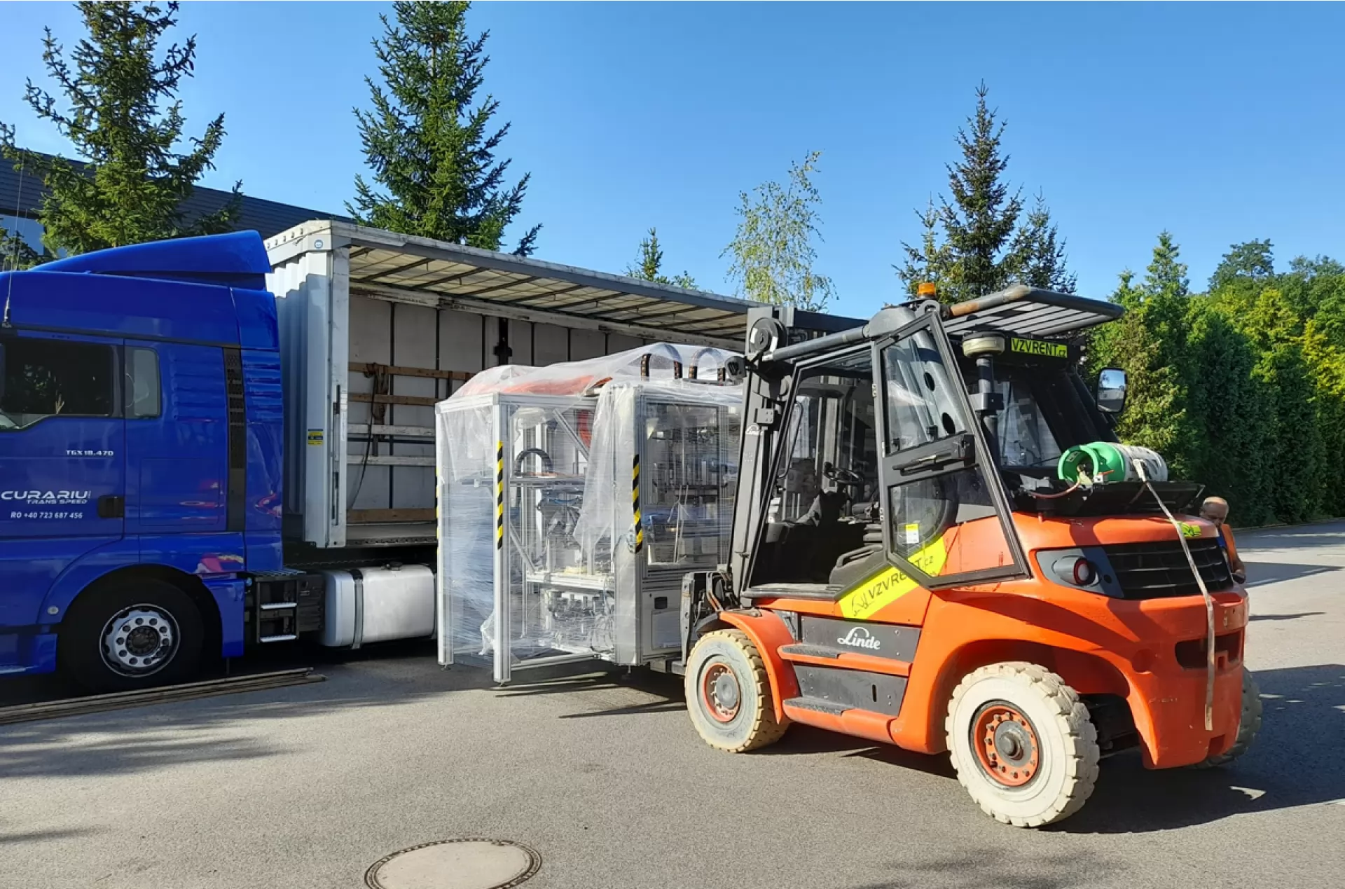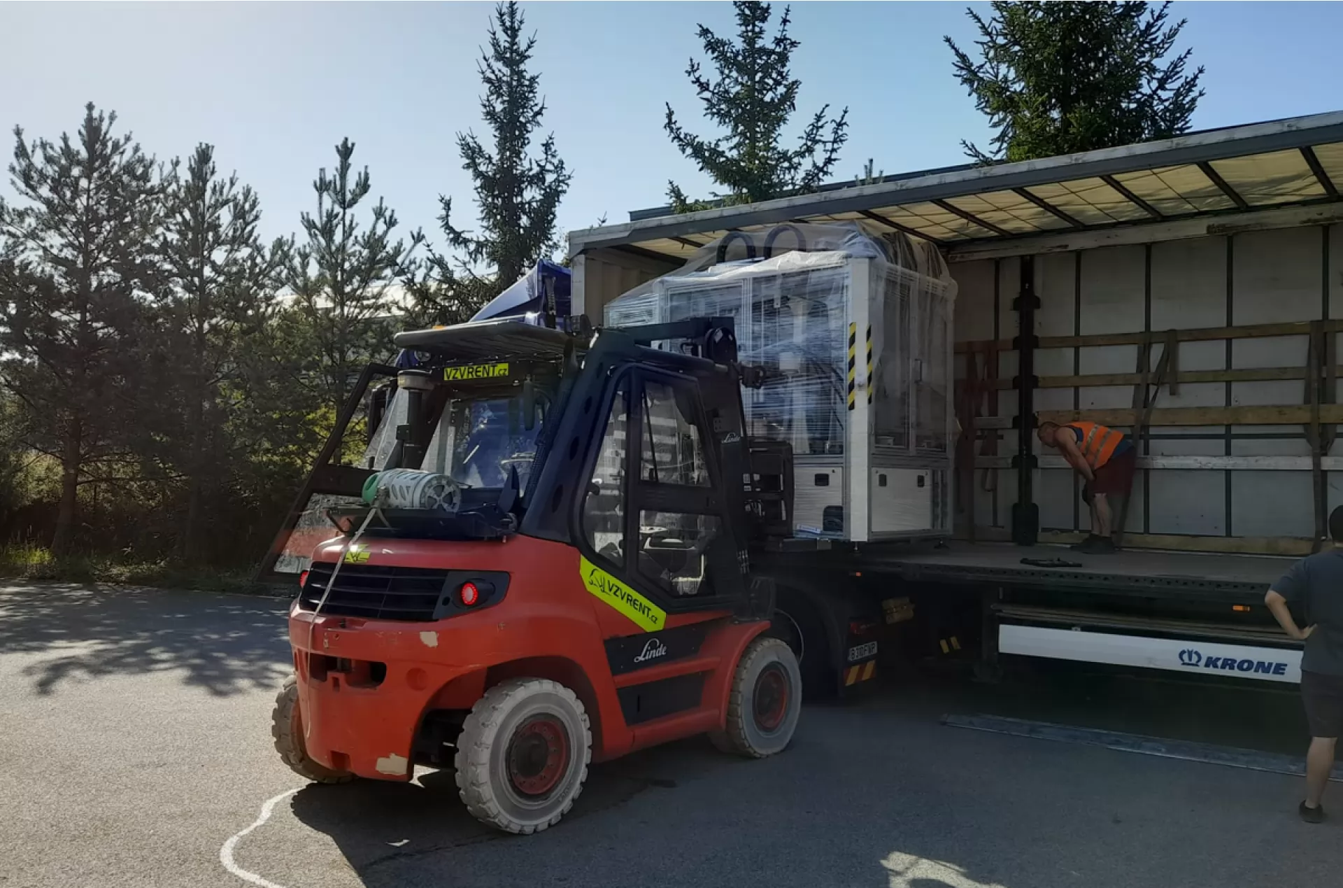 V Úvalech bylo potřeba naložit stroj na kamion. Toho se ujal náš zkušený řidič Martin s vysokozdvižným vozíkem Linde H 50 T. Tento vozík je vybaven nešpinícími pneumatikami a tak je i díky plynovému pohonu ideálním pro práci venku i uvnitř hal.