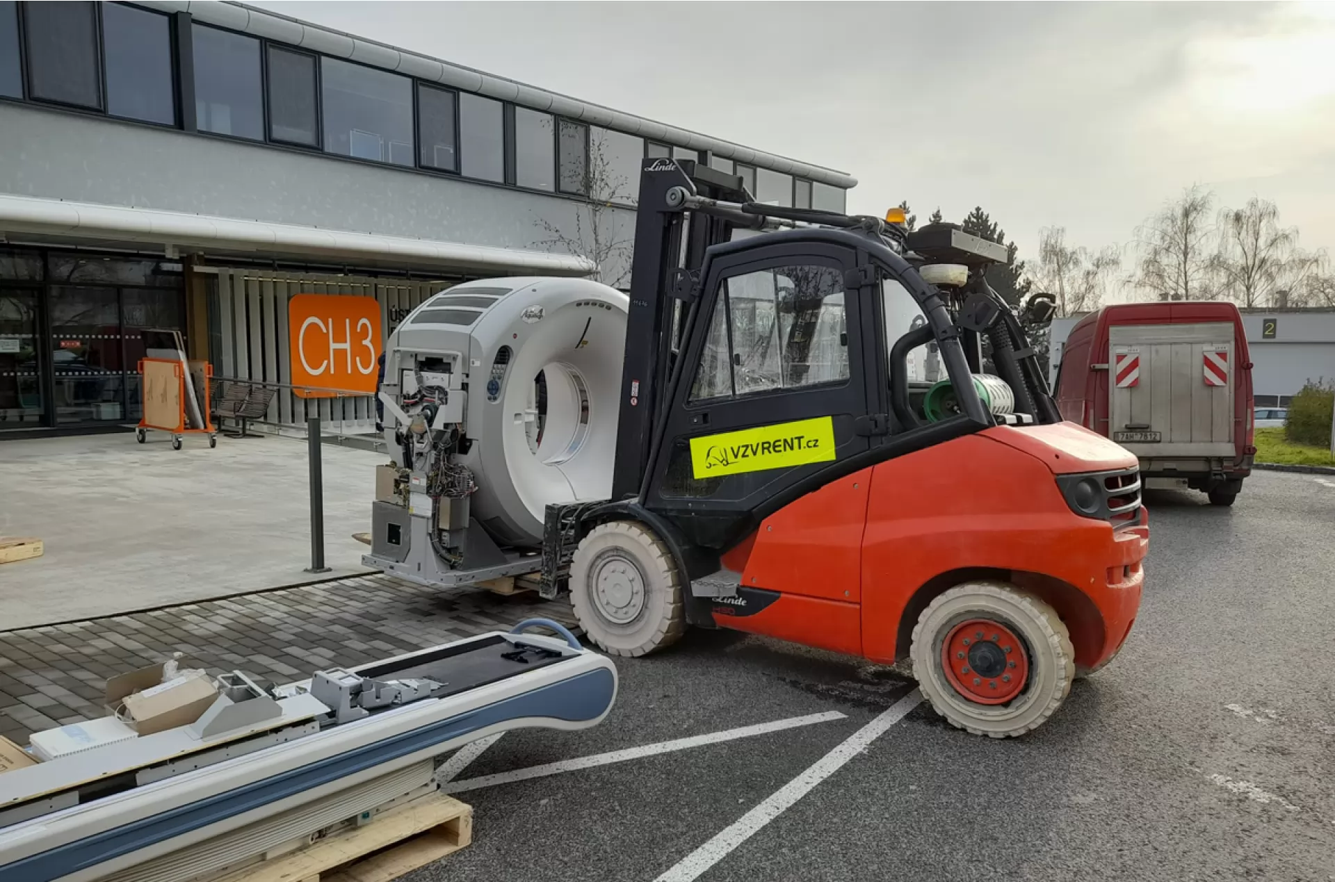 Vysokozdvižný vozík Linde H 50 T s nosností 5 tun a výškou zdvihu až 5,85 m byl vyslán na pomoc do Ústřední vojenské nemocnice v Praze. Náš zkušený řidič měl na starost převoz CNC stroje.