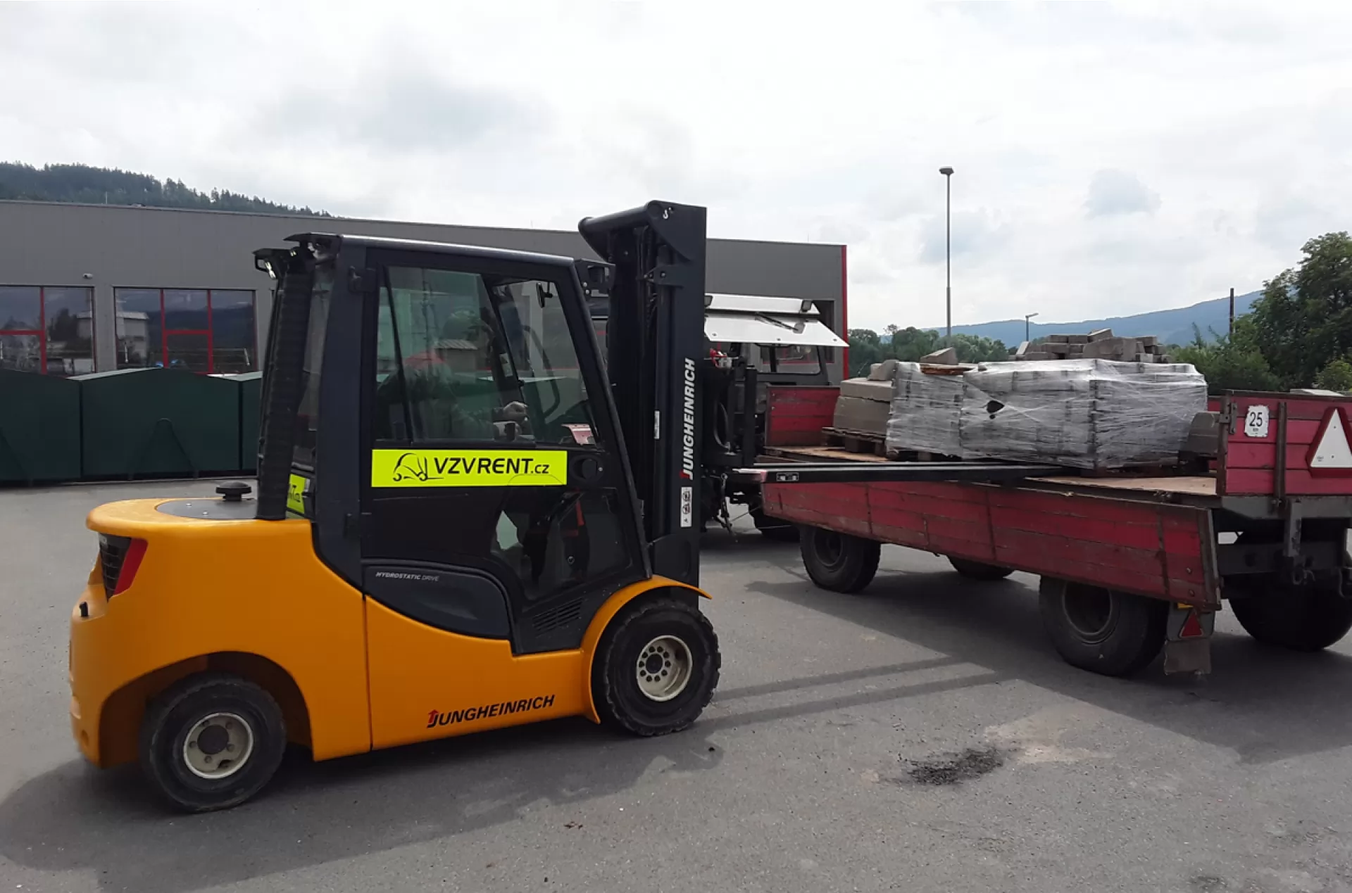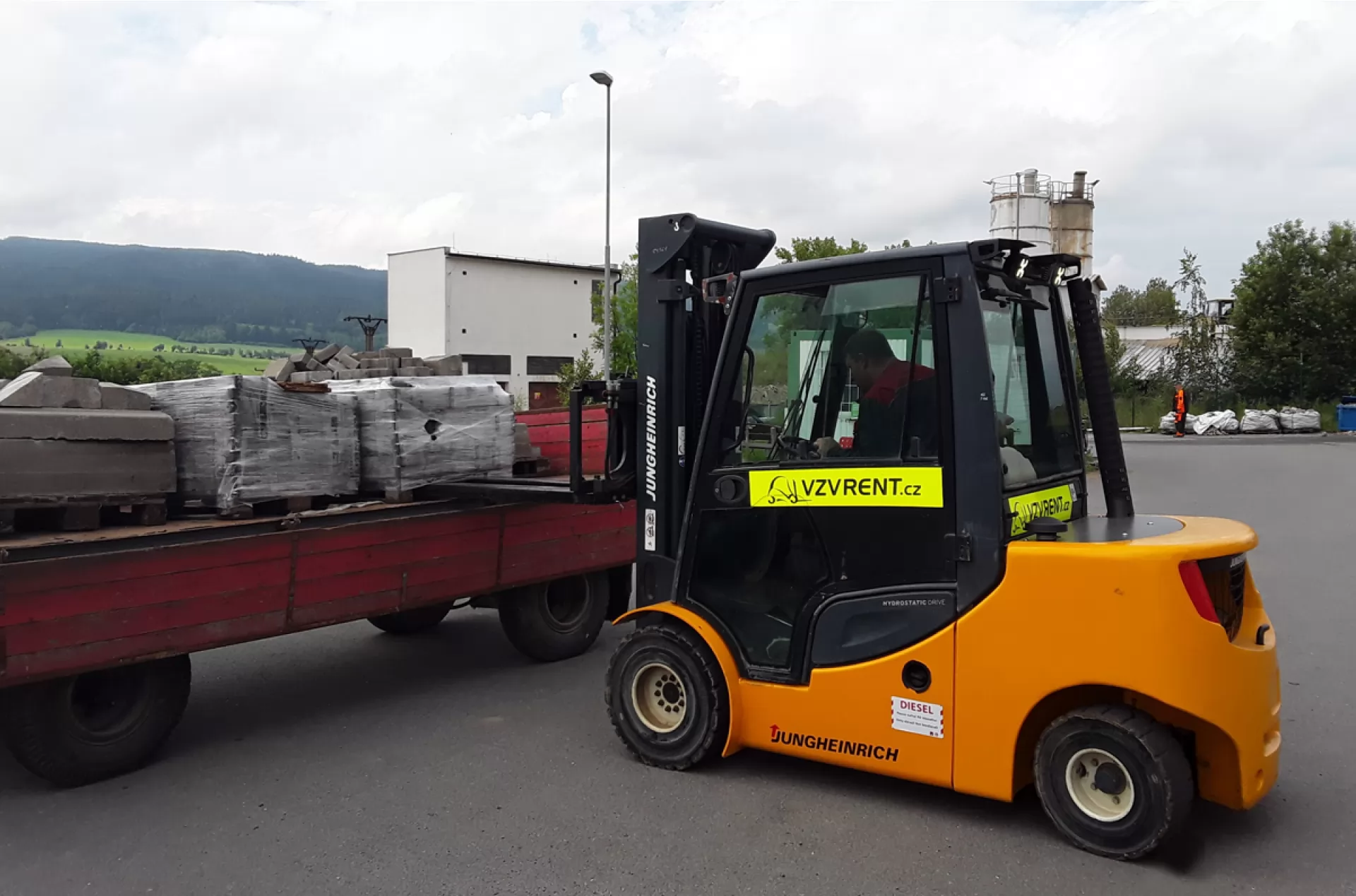 Obci Červená Voda jsme pronajali čelní dieselový vysokozdvižný vozík JUNGHEINRICH s obsluhou. Náš řidič s pomocí vozíku skládal stavební materiál.