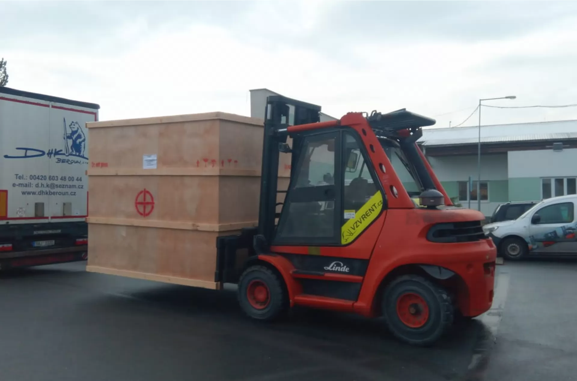 Vysokozdvižný vozík Linde H 60 D-03 s nosností 6 tun a výškou zdvihu až 3,75 m byl vyslán na pomoc společnosti Beiomedica do vesničky Hořátev. Náš zkušený řidič měl na starost složení a uložení několika strojů v přepravních baleních.