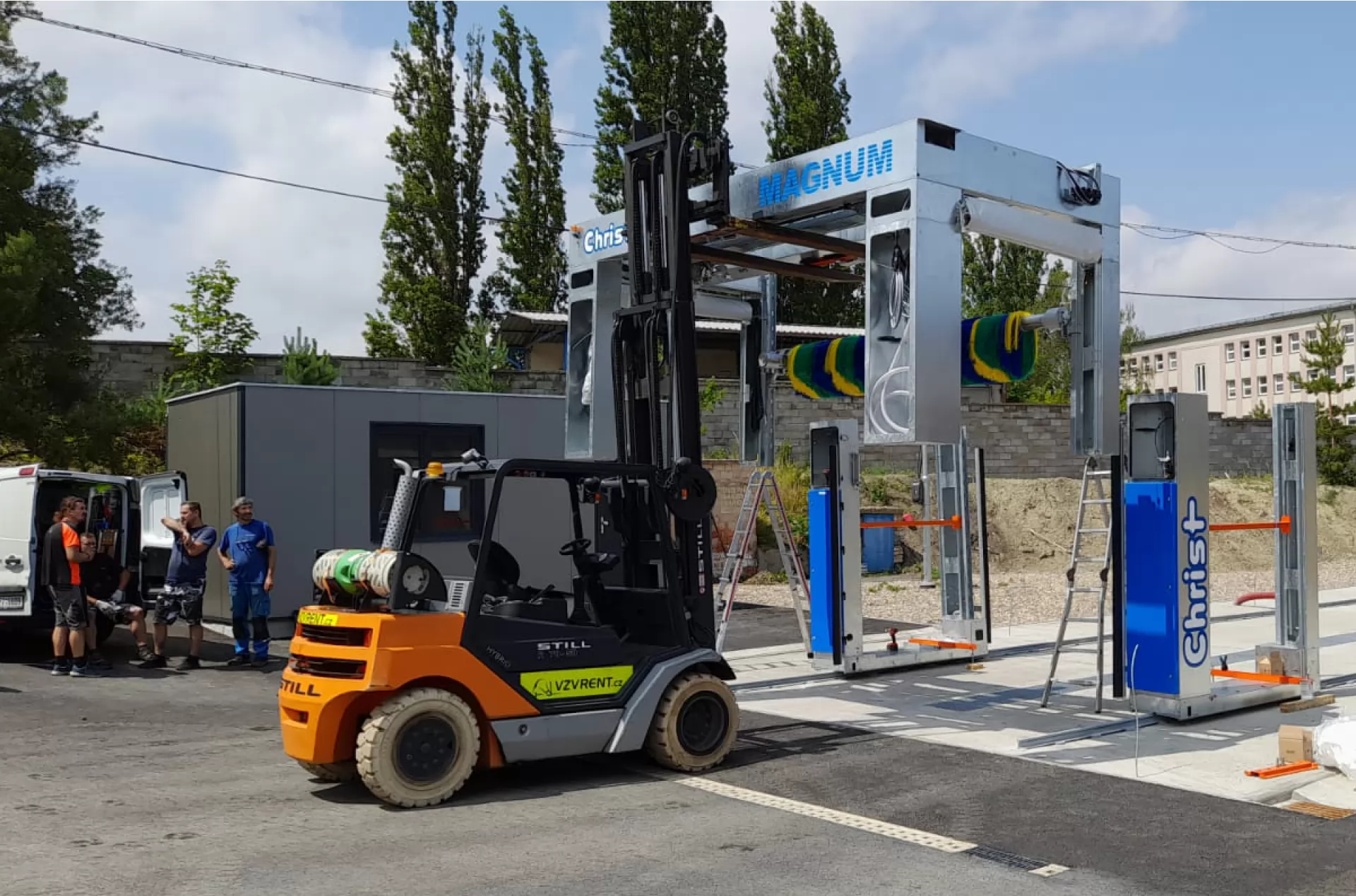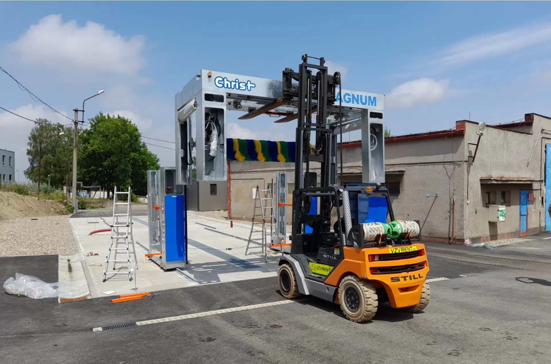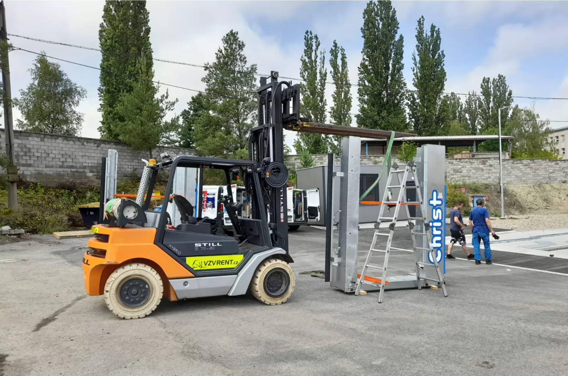 Naše další zakázka pro společnost Otto Christ Wash Systems s.r.o. byla tentokrát v Lounech u Prahy. Z flotily naší půjčovny jsme do pronájmu vyslali vysokozdvižný vozík STILL R 70-50 T s LPG pohonem, integrovaným bočním posuvem a nosností až 5 tun. Obsluhy tohoto vozíku se ujal náš řidič Martin, který pro klienta složil a sestavil myčku pro kamiony.