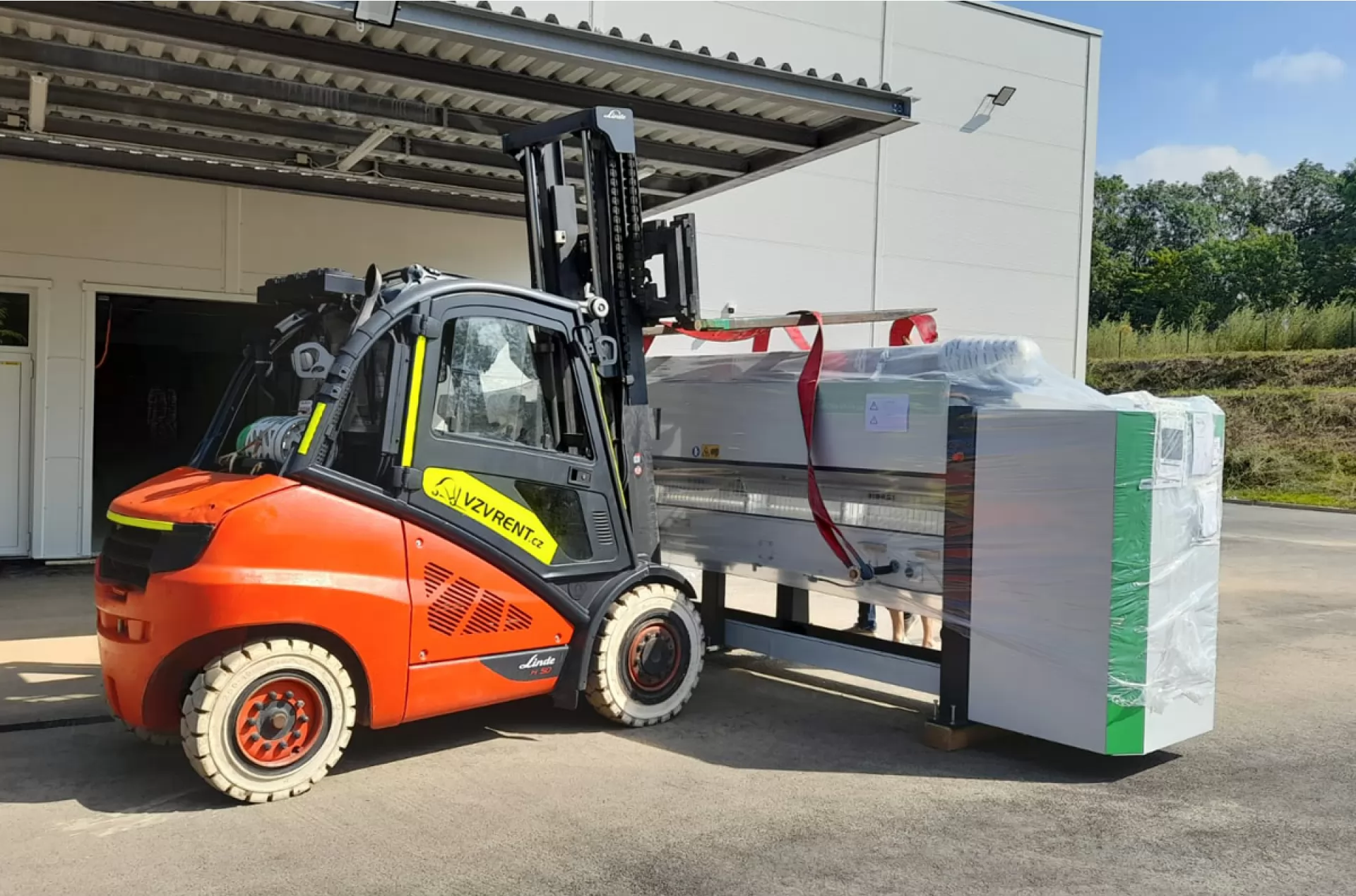 Tento plynový vysokozdvižný vozík Linde H 50 T byl pronajat do pražského Újezdu nad Lesy. Zde s jeho pomocí náš řidič Martin složil a na své místo uložil novou CNC frézu.