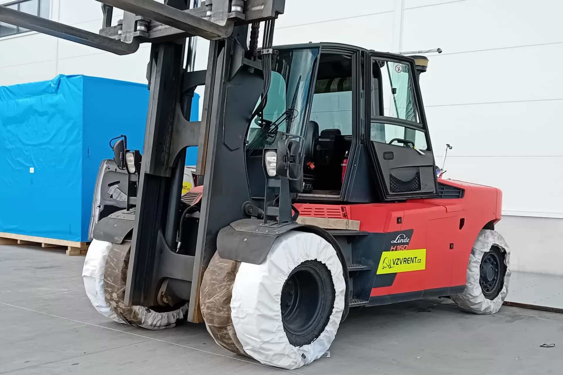 • Také Linde H 160 si s prací v Plzni poradil bez problému. Při plnění úkolu dostal náš stroj i speciální obutí – ochranné návleky na kola.