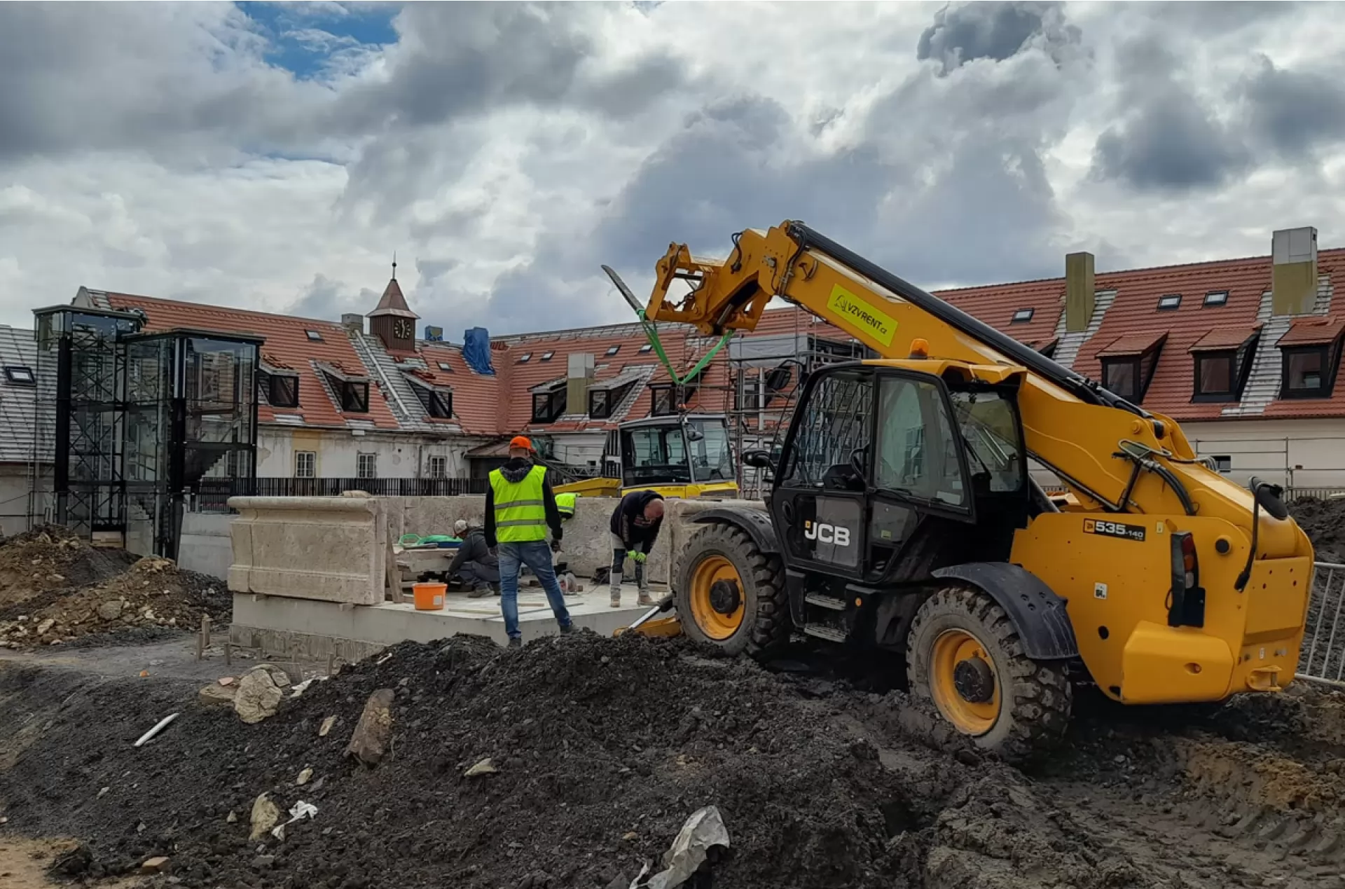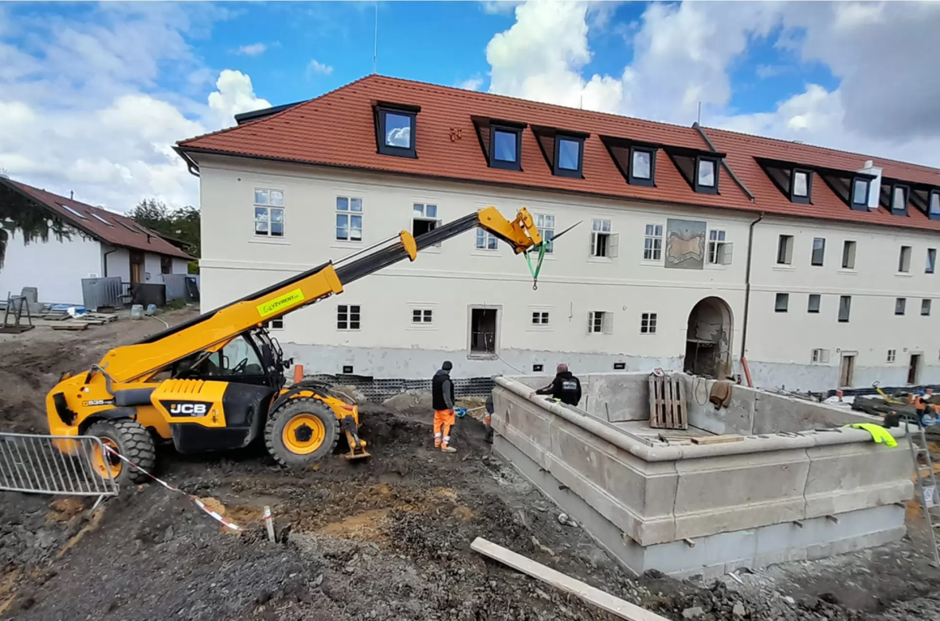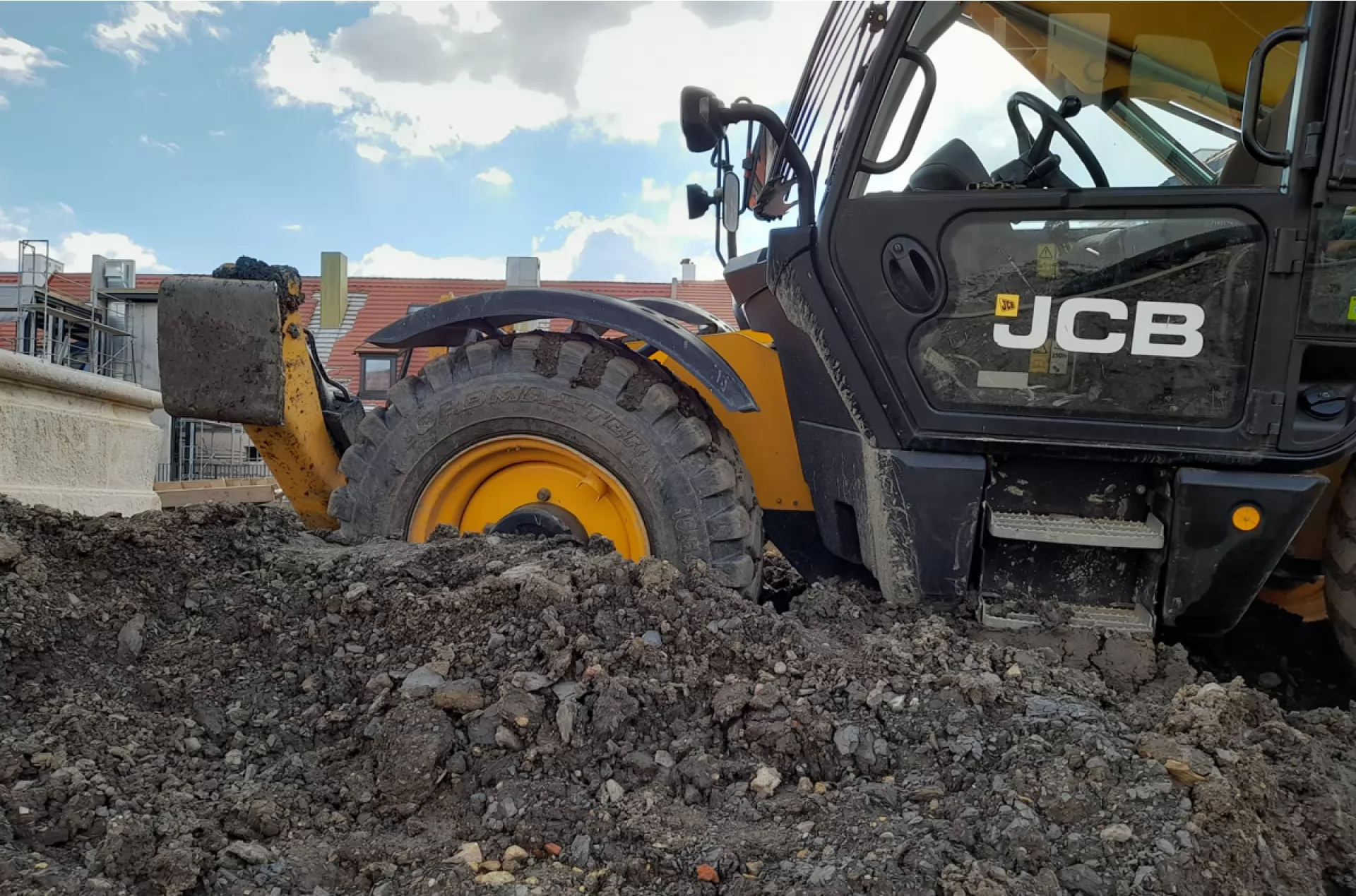 Dva dny v akci strávil náš teleskopický manipulátor JCB 535 skládáním kamenných desek po restaurování a stavbou kašny. Těžký bahnitý terén není pro manipulátory žádnou překážkou, díky mohutným kolům a pohonu 4x4 se dostanou i na hůř dostupná místa.