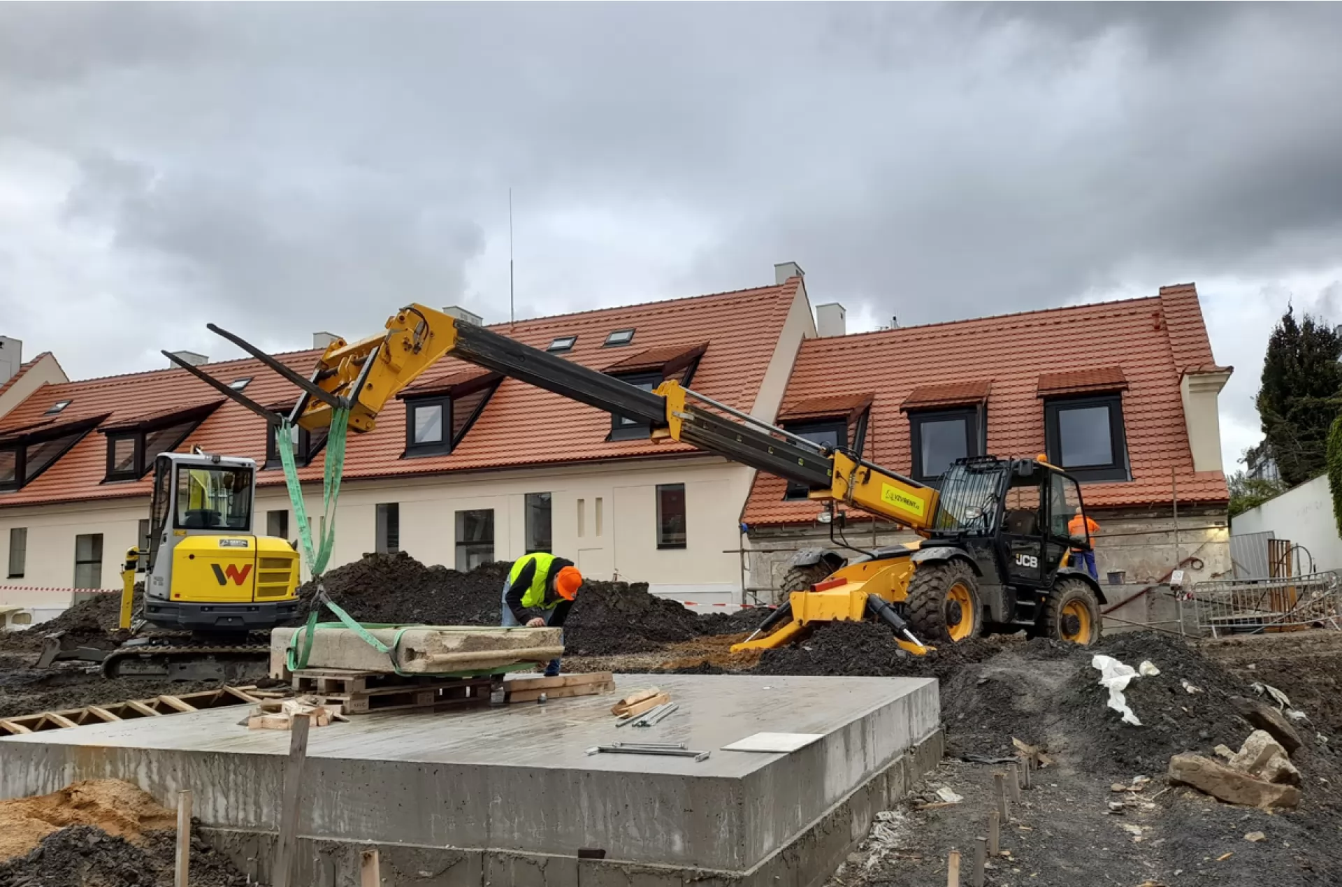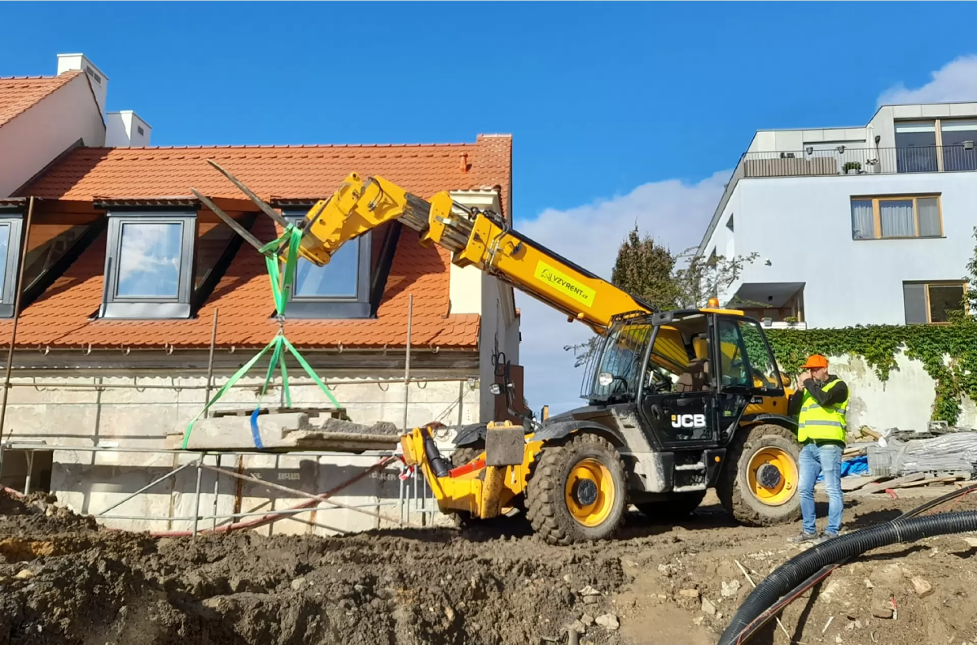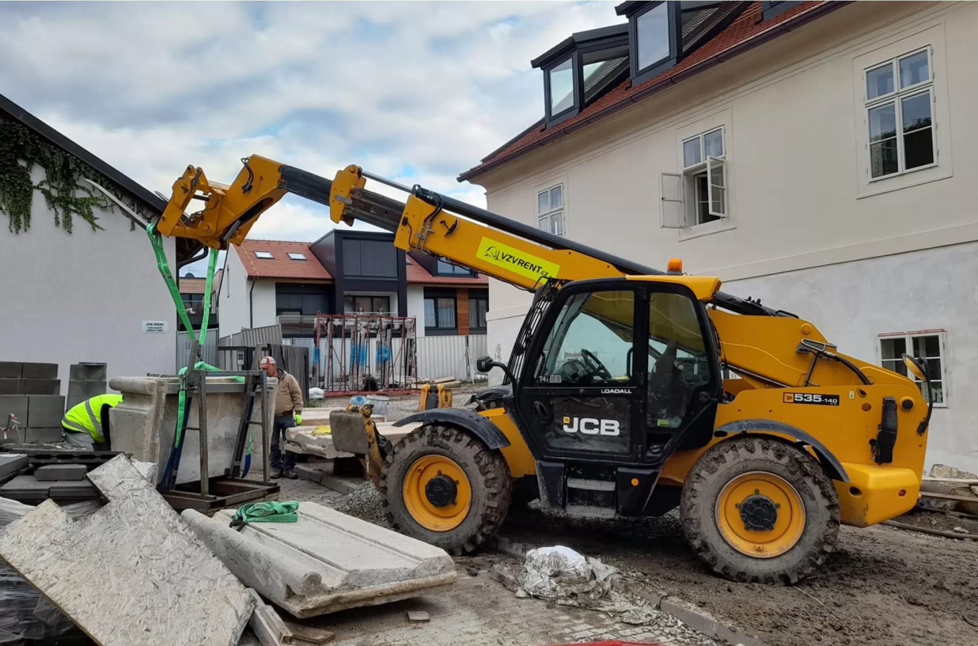 Dva dny v akci strávil náš teleskopický manipulátor JCB 535 skládáním kamenných desek po restaurování a stavbou kašny. Těžký bahnitý terén není pro manipulátory žádnou překážkou, díky mohutným kolům a pohonu 4x4 se dostanou i na hůř dostupná místa.