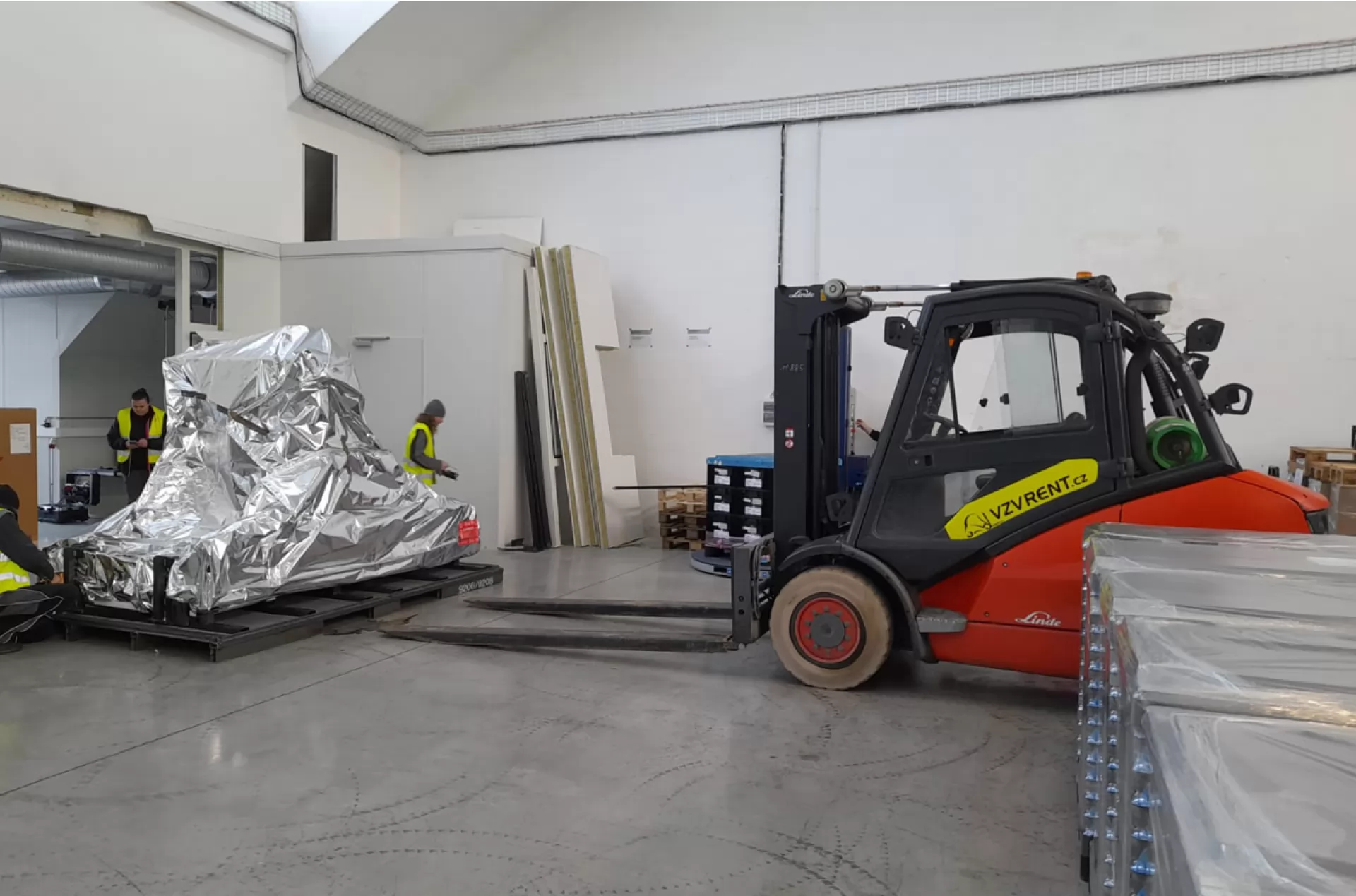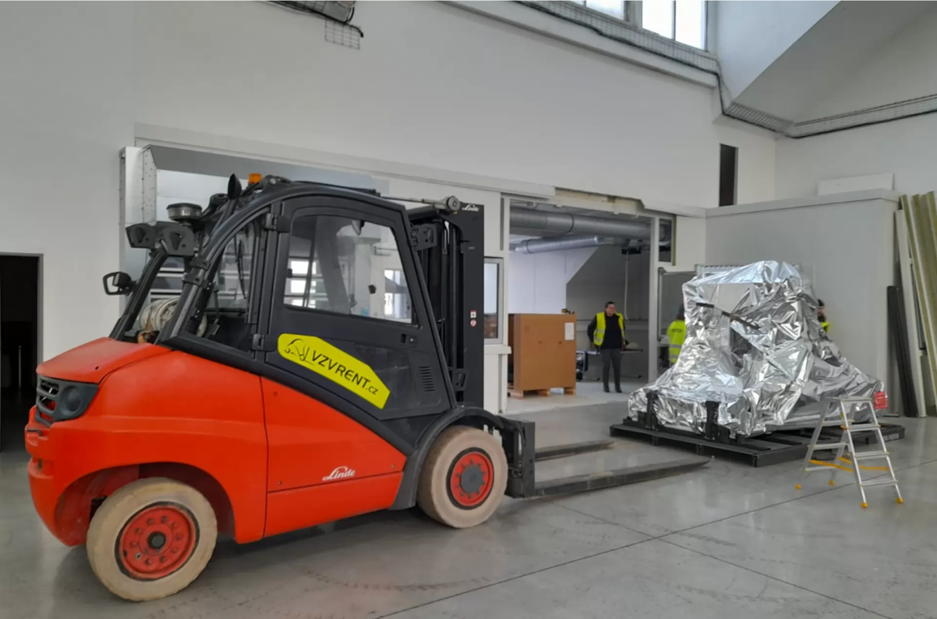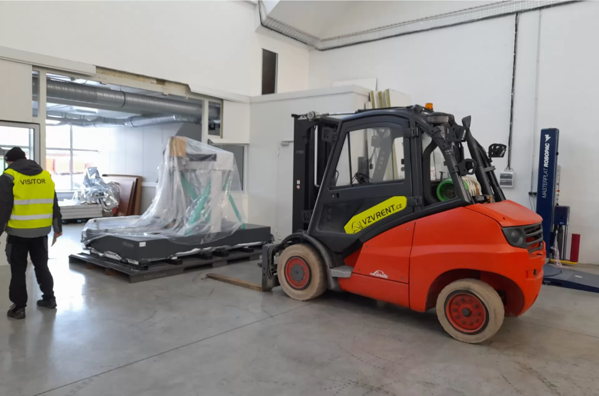 Tentokrát jsme z naší flotily do terénu vyslaly plynový vysokozdvižný vozík Linde H 50. Náš řidiš spolu s tímto vozíkem měli za úkol uložení stroje v Klášterci nad Ohří. Vozík je vybaven nešpinícími pneumatikami a tak po něm na světlé podlaze haly nezůstala ani stopa.