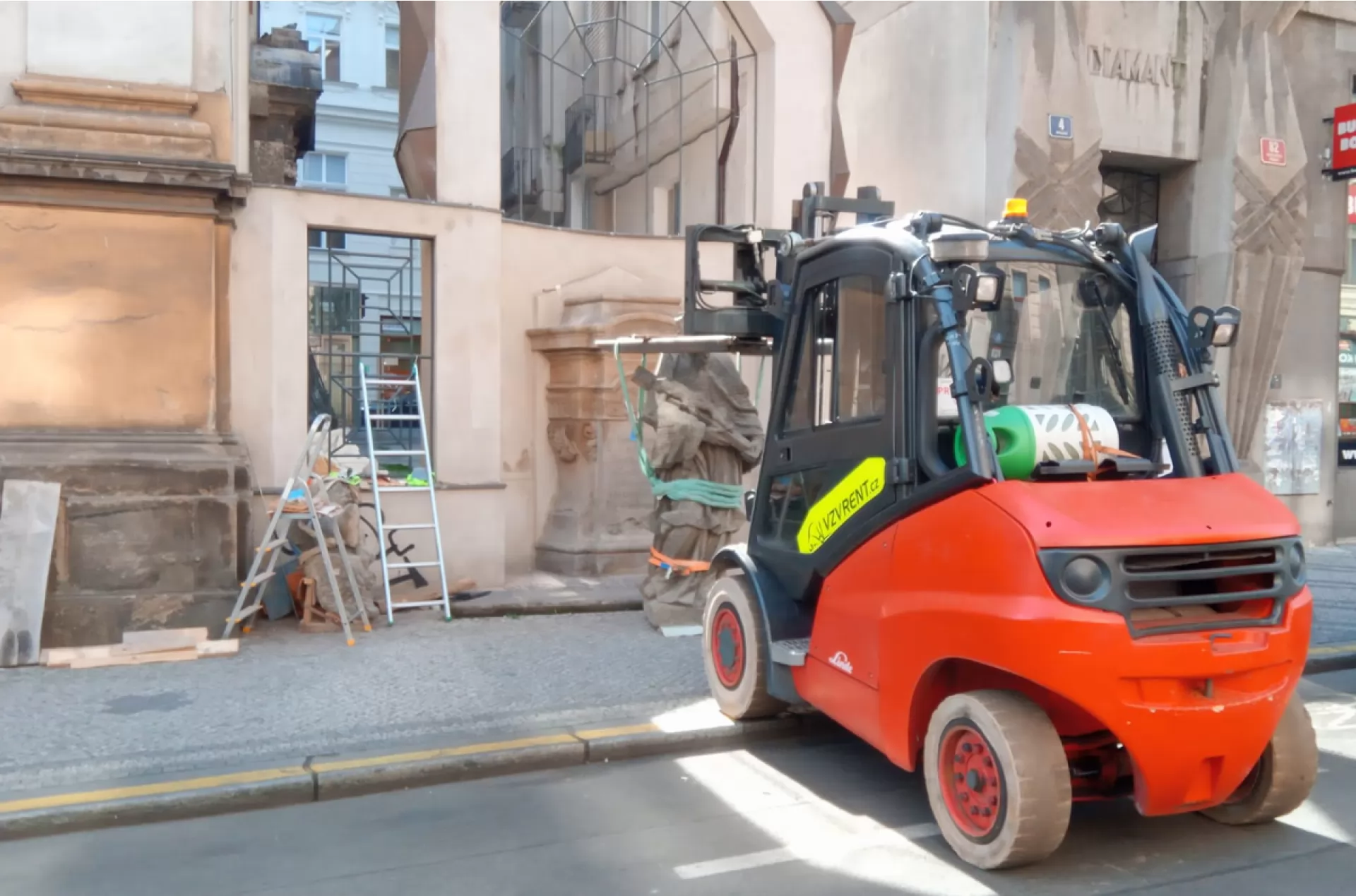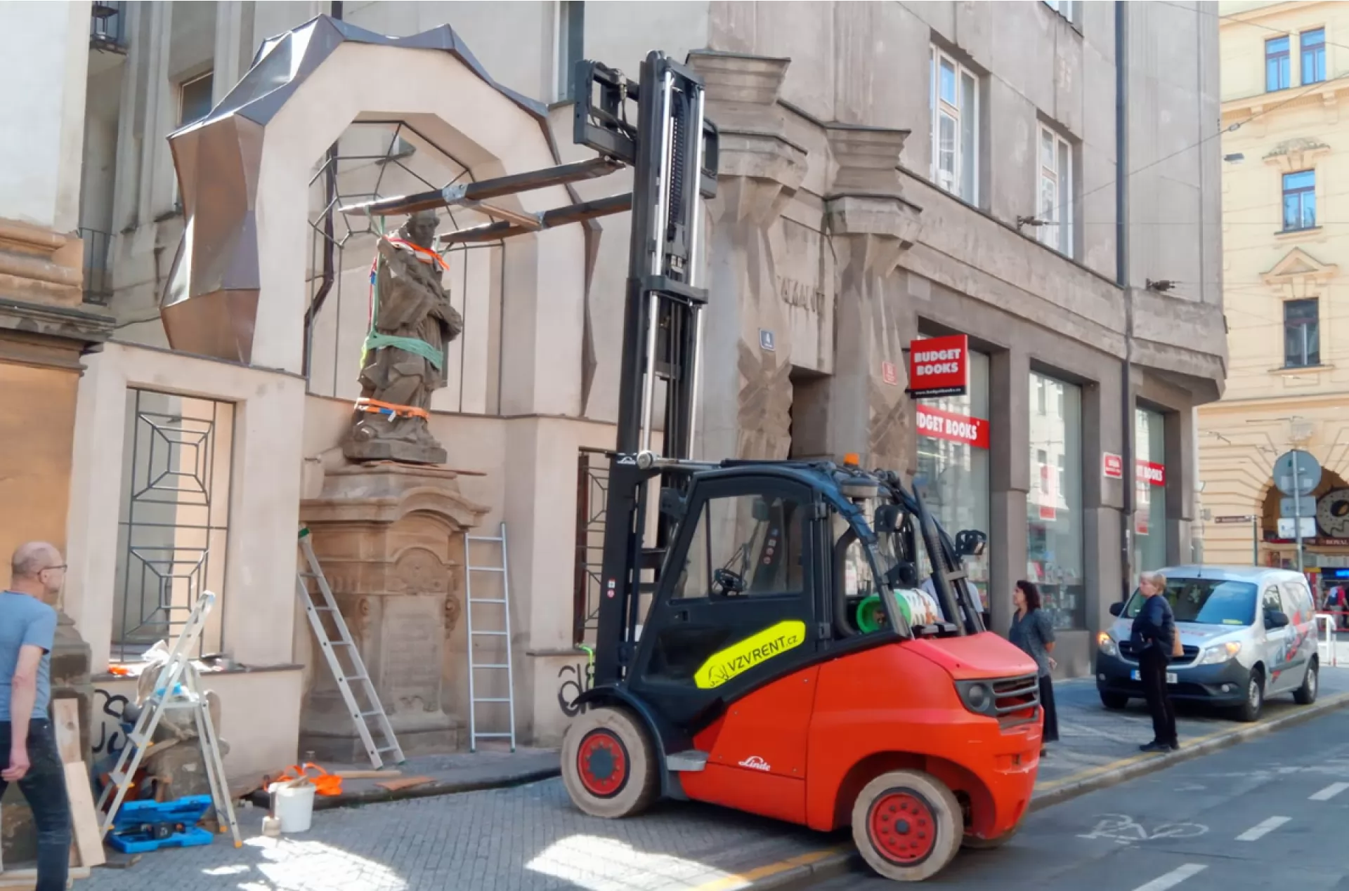 V centru Prahy jsme pomáhali s usazením sochy Jana Nepomuckého ke kostelu Nejsvětější Trojice ve Spálené ulici. O obsluhu plynového vysokozdvižného vozíku Linde H 50 Tse postaral náš zkušený řidič Martin.
