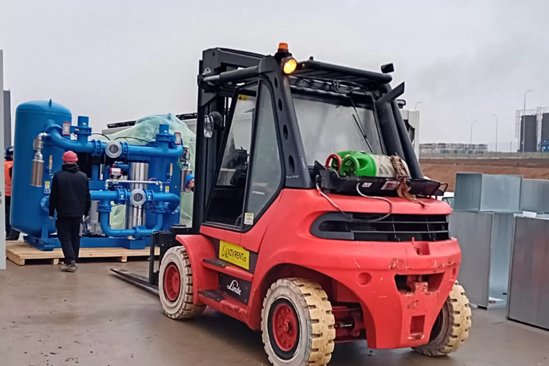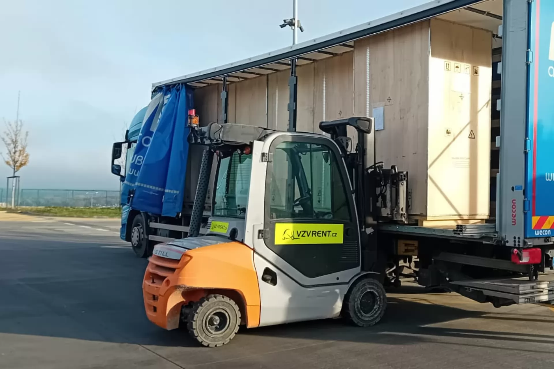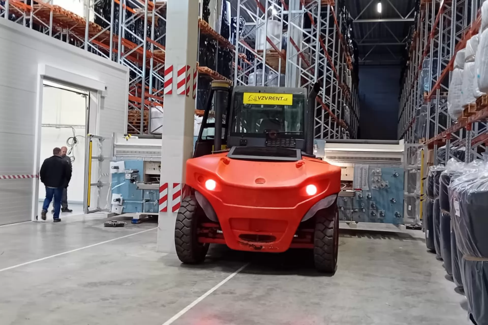 V Dobrovízi jsme pomocí čelního vysokozdvižného vozíku Linde H120 zajišťovali složení a přesné uložení výrobní linky. Tentokrát nás neprověřila jen hmotnost a rozměry jednotlivých celků, ale i minimální prostor na manévrování. Manipulovali jsme v opravdu stísněných podmínkách, kde se nedalo ani pořádně fotit — právě proto byla preciznost každého pohybu naprosto zásadní.